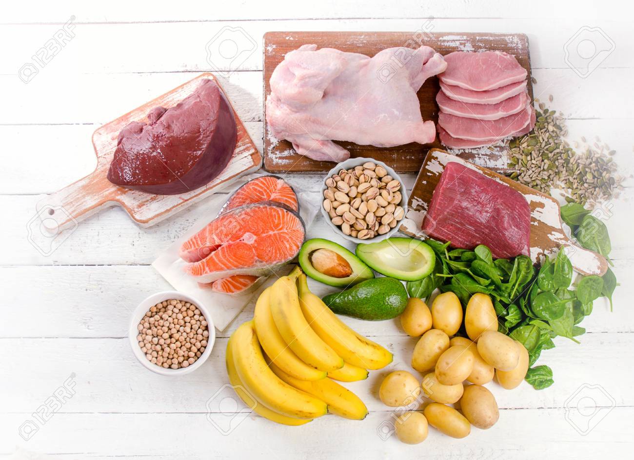 ビタミンBを多く含む食べ物は、豚肉、卵、レバー、全粒穀物です。